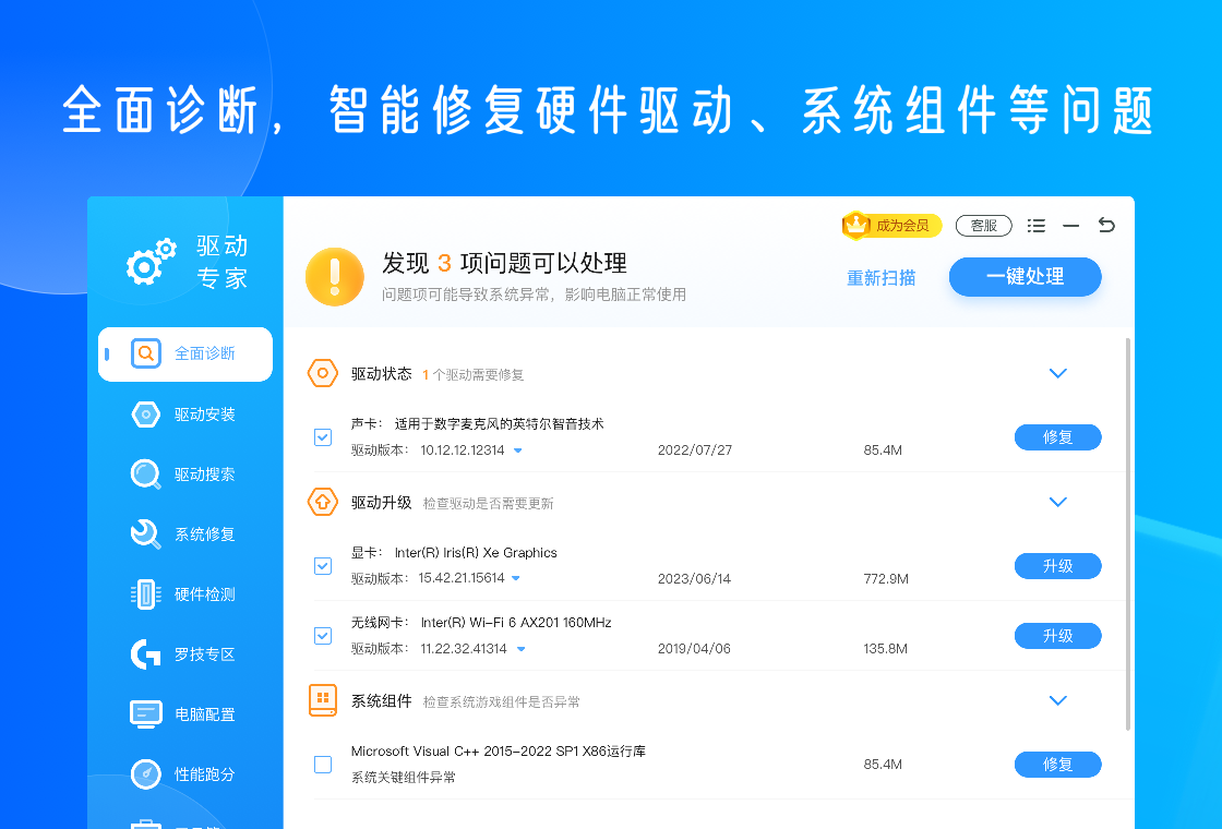 4、针对系统和游戏运行中出现的异常情况,驱动专家具备智能修复功能。它能够有效解决 DLL 文件丢失、运行库异常等常见问题,确保电脑系统和游戏的稳定运行。