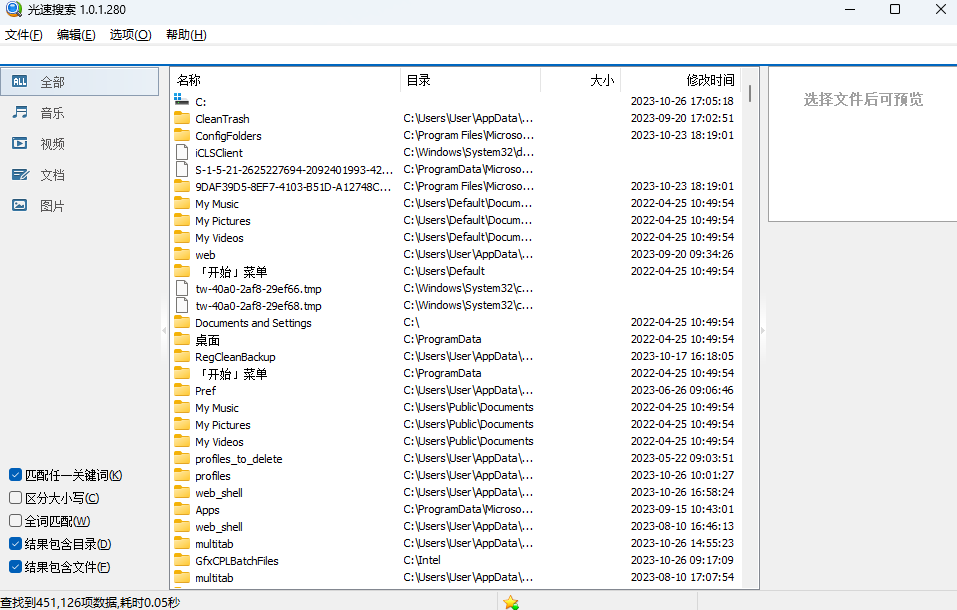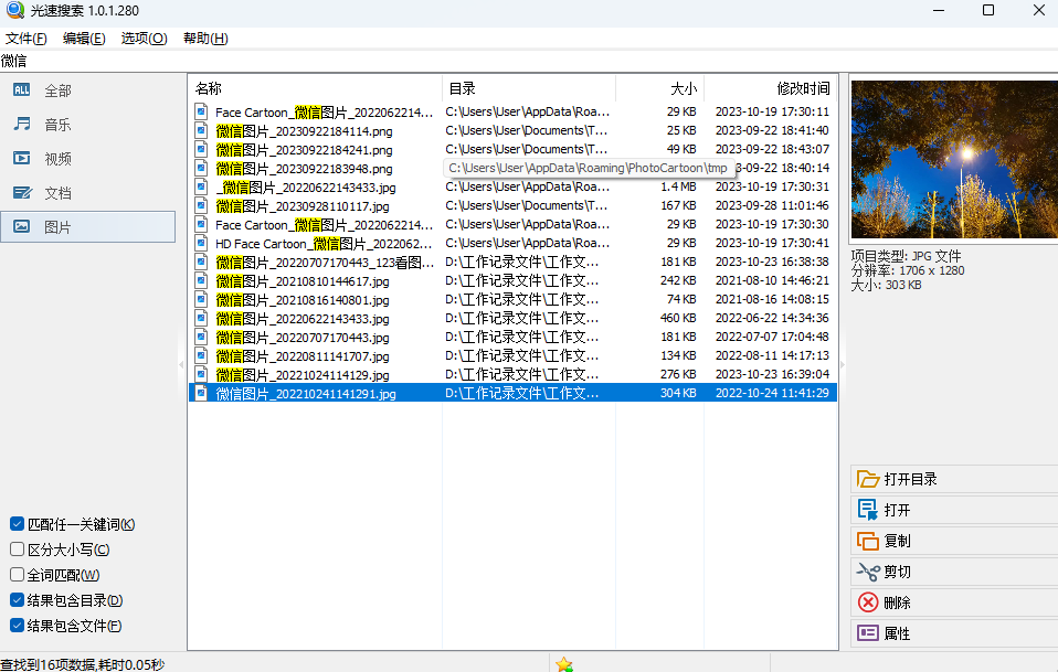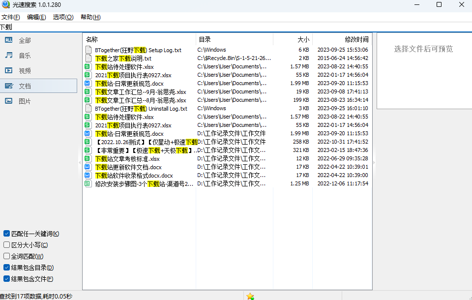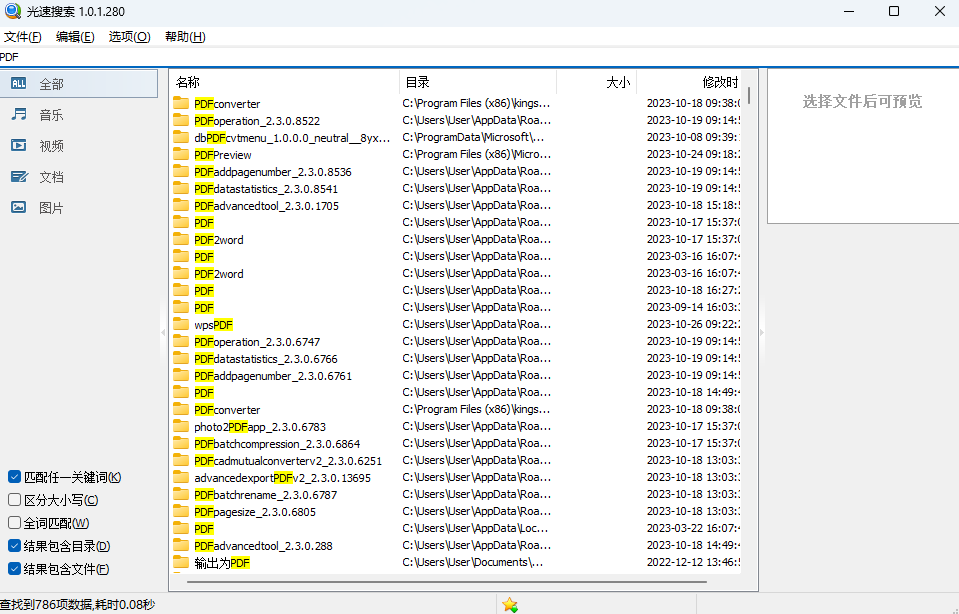 支持关键字快速搜索,结果秒级显示,可快速定位文件位置。
