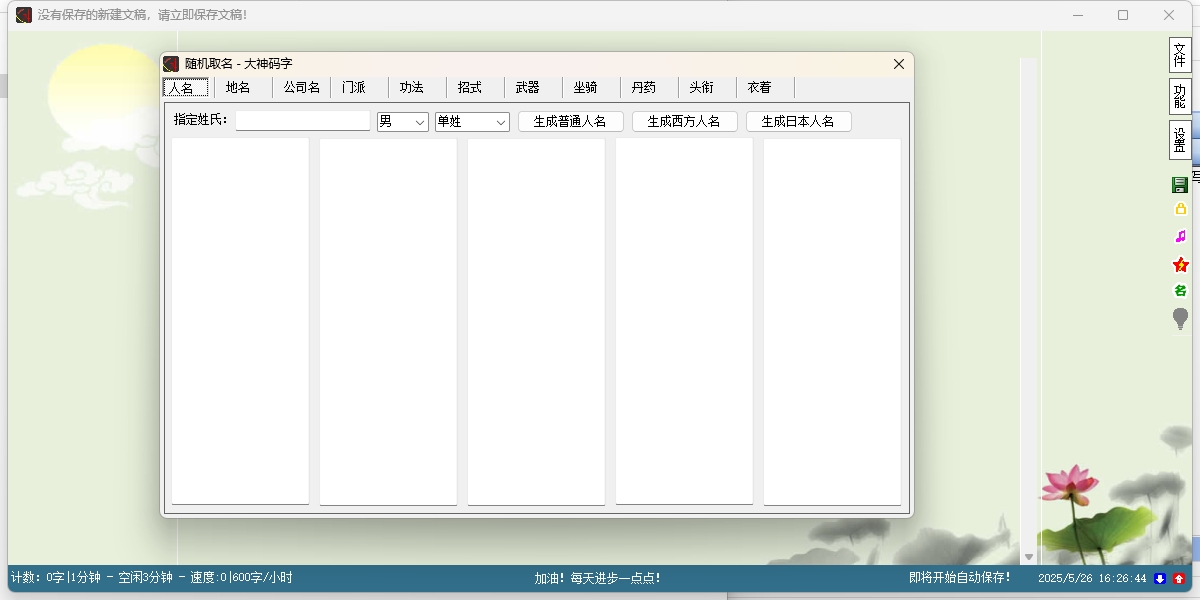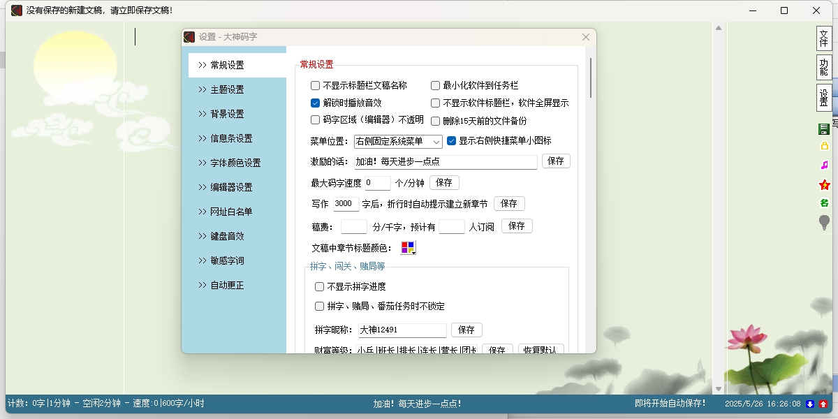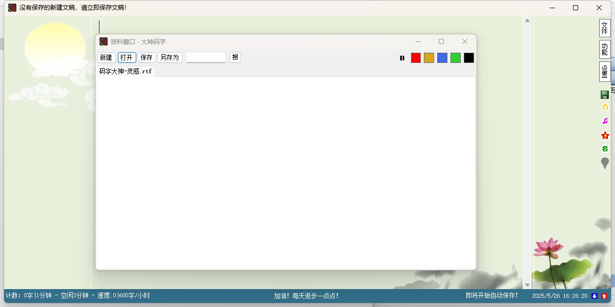 大神码字是一款非常强大的码字工具,大神码字电脑版之中用户可以在软件之中持续的进行码字,该软件具备计划码字功能,可以帮助用户每天按时完成必须的码字内容才能完全解锁电脑,让码字可以避免懒惰没人监督而无法持续码字。