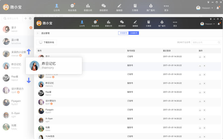 微小宝是一款功能强大的公众号运营平台,微小宝电脑版之中用户可以在软件之中快速进行账号内容的数据分析、粉丝互动以及内容管理等等功能,可以帮助用户一个软件管理多个账号以及平台,让用户工作可以更加轻松和快速。