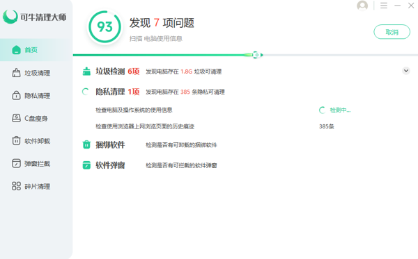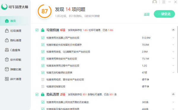 可牛清理大师能深度清理系统无用的缓存文件、临时文件等,还支持上千款常用软件的垃圾清理,可以有效拦截各种软件的恶意弹窗,让用户免受弹窗干扰,享受安静的电脑使用体验;在面对大文件能快速定位 ,并支持将系统盘中安装的软件批量迁移至其他磁盘,转移虚拟内存,帮助整理更多 C 盘可用空间。