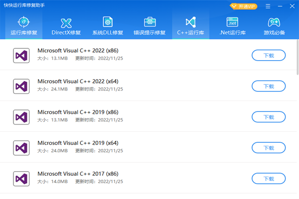 快快运行库修复助手提供一键修复功能,用户只需点击一次按钮,即可自动检测并修复系统中的运行库问题,无需手动查找和修复运行库错误,界面简洁直观,操作简单易上手,即使是非专业用户也能轻松使用。