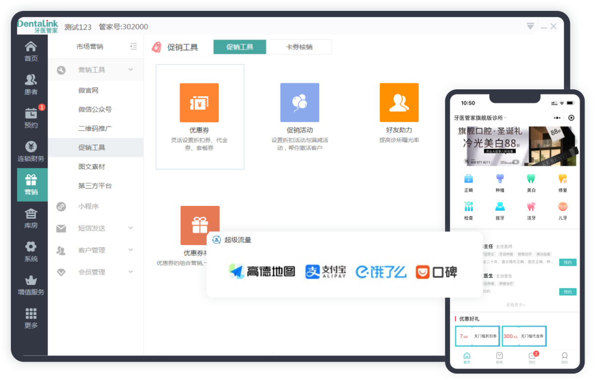 支持对接阿里本地生活等流量平台,通过会员营销和线上促销活动吸引新客,并实现预约到店核销闭环。
