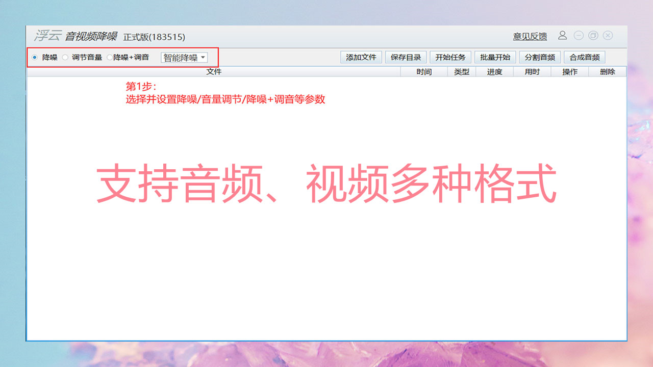 浮云音频降噪支持多个文件批量降噪,快速的帮助用户完成工作内容,并且软件还可以对音频进行一定的编辑,可以调整音量还可以删除部分不需要的音频内容,让音频之中杂乱的部分快速删减。