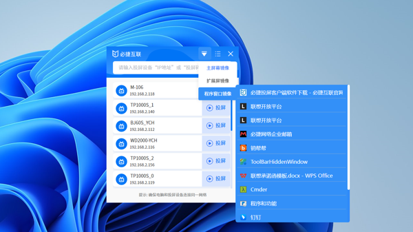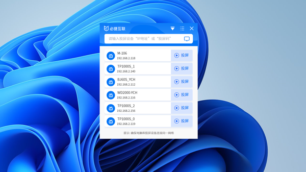 必捷投屏是一款非常强大的无线投屏工具,必捷投屏电脑版只需要用户安装了对应的必捷无线投屏盒子、多路无线投屏BOX等等设备,就可以快速的进行无线投屏,支持高清画质,让用户可以将清晰的画面输送到各个设备上,让观看者体验更好。