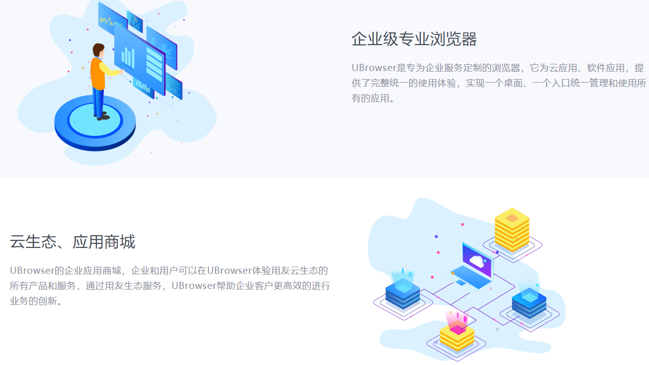 1、UClient 对传统浏览器的功能进行了精心的优化与精简,摒弃了一些边缘特性,将重点聚焦于应用的装载和用户体验上。