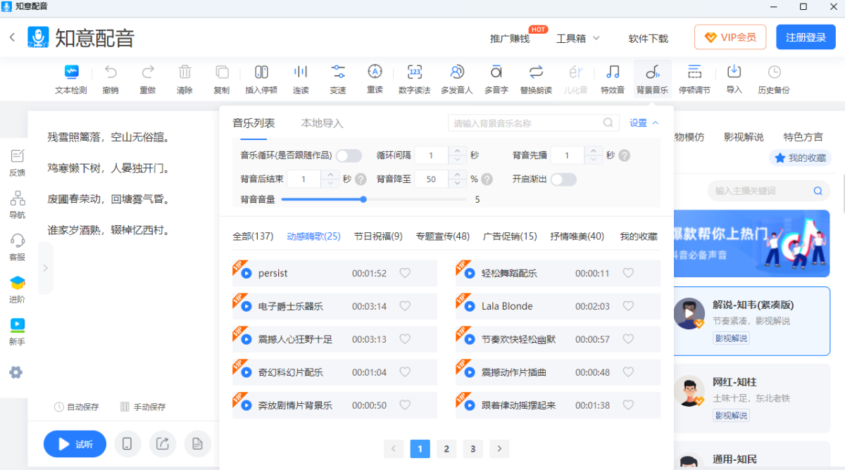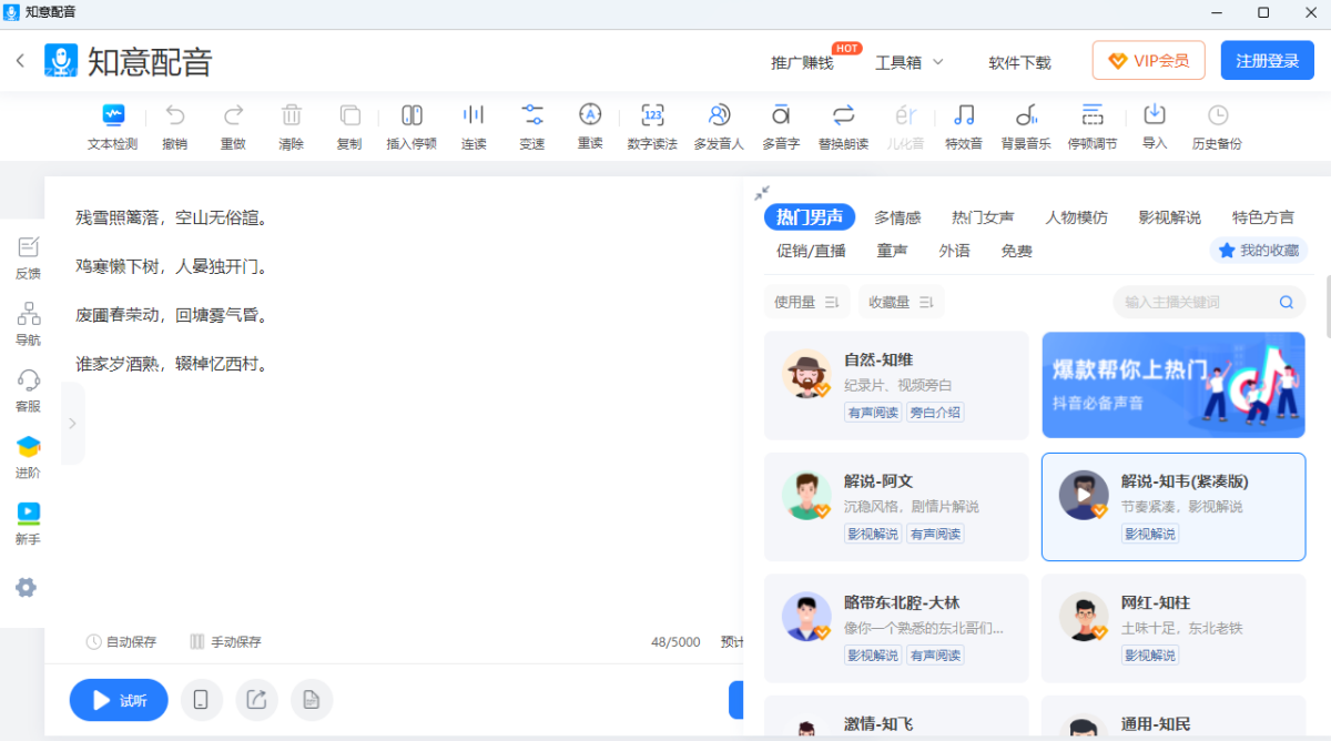 知意配音专注于AI文字转语音技术的在线配音工具,软件可以通过先进的语音合成技术,为用户提供高度自然、富有情感且多样化的AI语音生成服务,帮助用户快速将文字内容转换为高质量的音频文件,广泛应用于视频制作、有声读物、教育培训等领域。