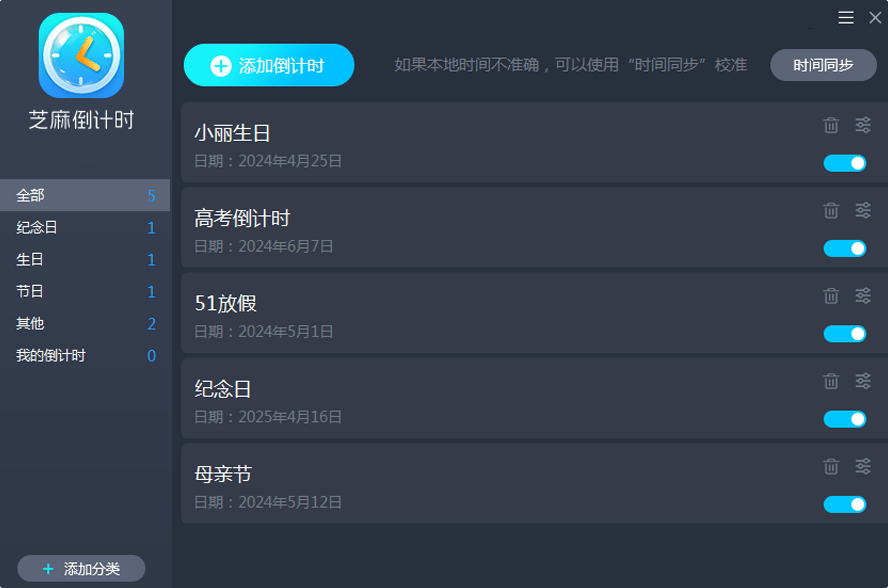 芝麻倒计时是一款好用的倒计时工具,芝麻倒计时电脑版之中用户可以在软件之中进行设立各种倒计时日子,包括生日、高考、节日以及纪念日等等特殊的日子,在设立这些日子的时候用户可以设置为循环,这样每年用户都会在纪念日开启的前几天获得相关提醒。