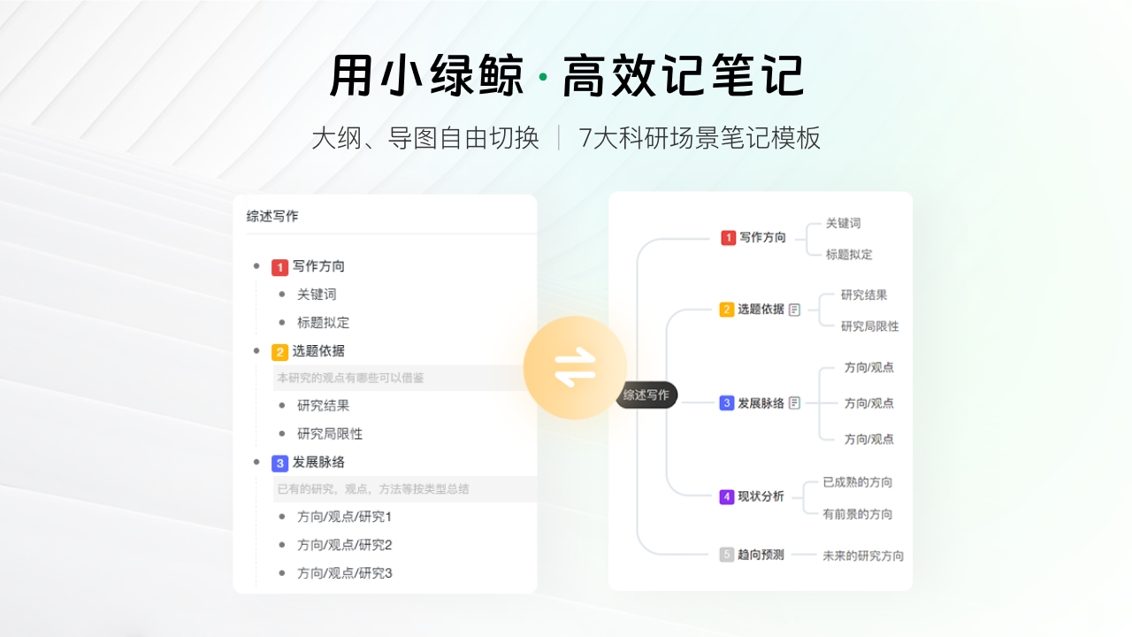 4、笔记功能旨在帮助科研人员更好地整理和回顾文献要点。支持大纲和思维导图两种笔记模式,大纲模式适合按照文献结构进行条理清晰的要点记录。