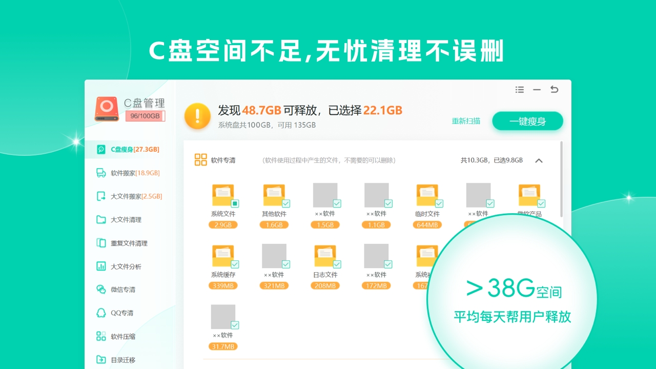 4、C 盘瘦身功能针对 C 盘进行专项扫描,精准定位其中的垃圾文件、无用文件以及系统缓存,用户只需一键操作,即可释放大量 C 盘空间。