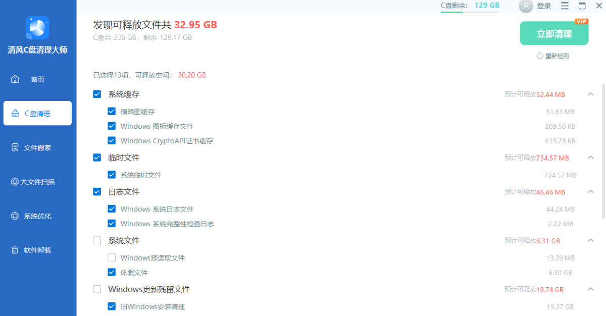清风C盘清理大师是一款很好用的系统清理工具,清风C盘清理大师电脑版转对设备的c盘进行扫描处理,可以扫描出系统缓存以及各种卸载软件产生的卸载残留,这些可以有效的减少c盘文件的负担,并且可以让软件卸载的更加干净。