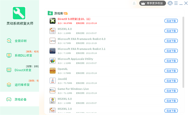 一键修复2000+常见DLL错误与DirectX问题,集成VC++/ .NET/Java等官方运行库全集,支持离线安装。