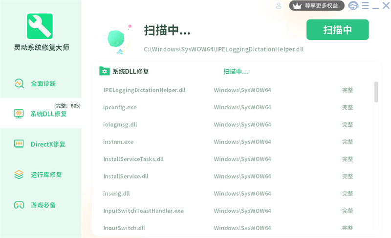 灵动系统修复大师具备简洁明了的操作界面,支持一键扫描和一键修复功能,用户只需简单操作,即可扫描当前电脑微软运行库、DLL 文件等异常状态,并自动进行修复,全程无需用户过多干预。
