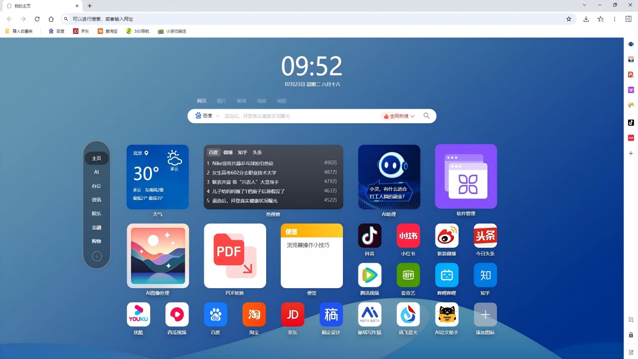 3、用户可以自由选择显示的小组件、调整组件的位置和大小,还可以添加自己常用的网站导航,使浏览器更加符合个人的操作习惯和需求。