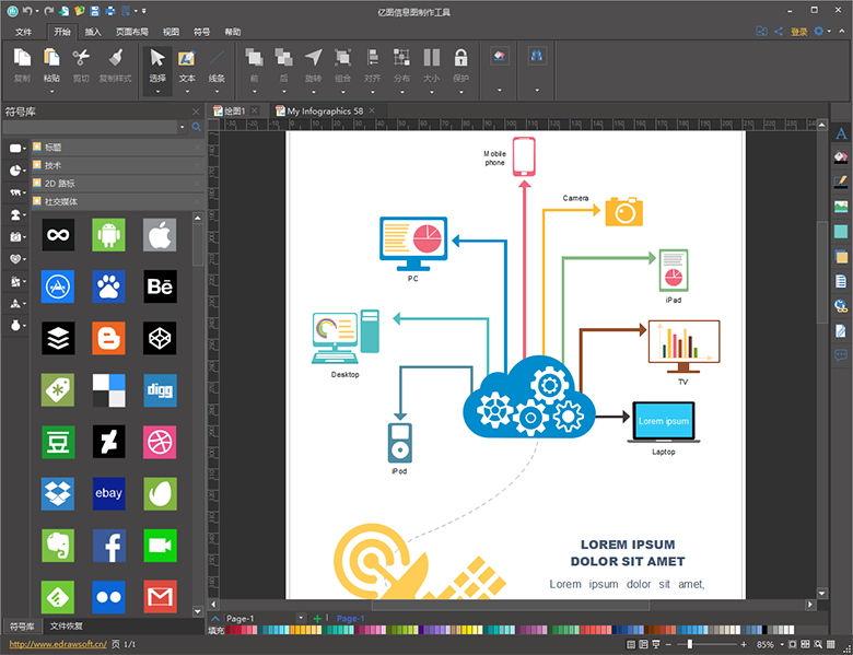 亿图信息图是一款好用的设计软件,亿图信息图电脑版之中有着非常多的平面设计工具,在这些工具的帮助下用户设计软件非常简单,只需要简单的拖拽就可以设计好信息图等内容,软件本身有着非常多的矢量图,所以无需担心无法设计。