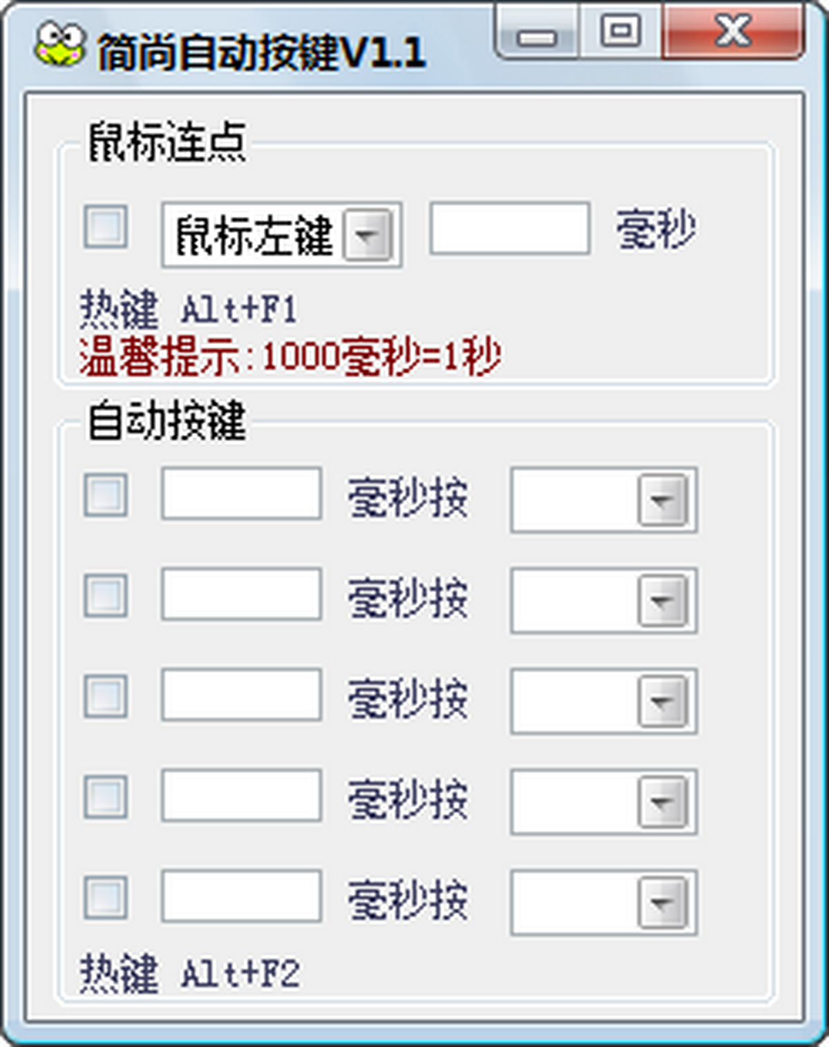 简尚自动按键是一款非常好用的连点辅助工具,简尚自动按键电脑版之中用户可以在软件之中设置各种频率的鼠标或者是键盘按键速度,在设置完成之后即可放开双手,该软件将会根据设置对着需要点击的地方进行设置频率进行点击。