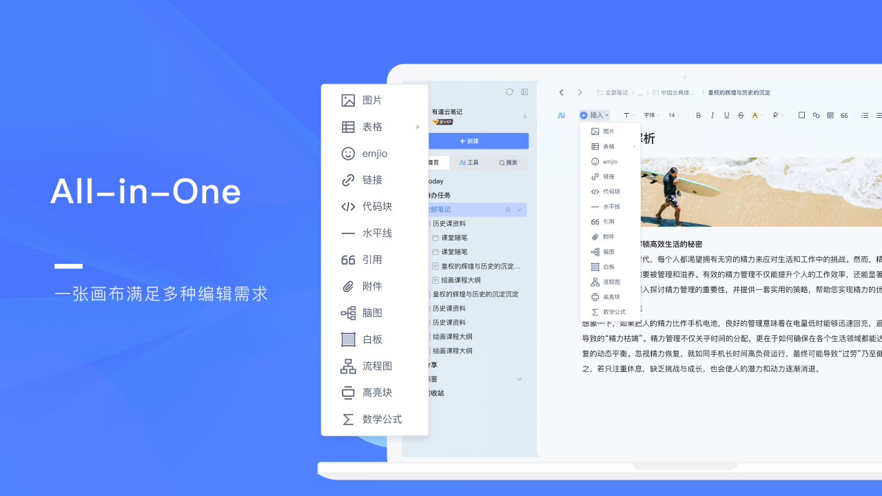 有道云笔记有着非常丰富的编辑格式,支持各种编辑工具,无论是表格、公式甚至代码都可以直接进行插入,帮助用户快速进行笔记,想自己的阅读感想记录下来,让灵感可以成为一个可实现的方式。