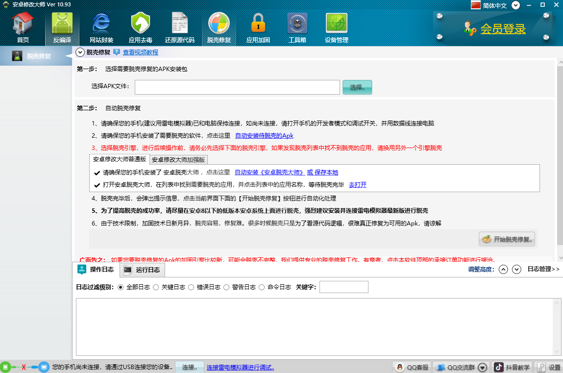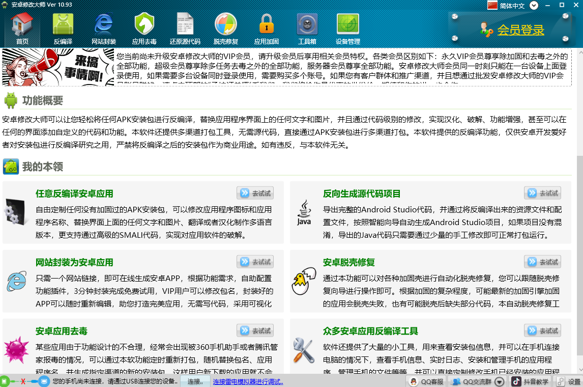 安卓修改大师是一款很强大的反编译软件,安卓修改大师电脑版可以帮助用户快速将apk安装包进行反编译,让后可以自行替换程序之中各种文字和图片内容,在完成之后还可以进行渠道打包非常方便。