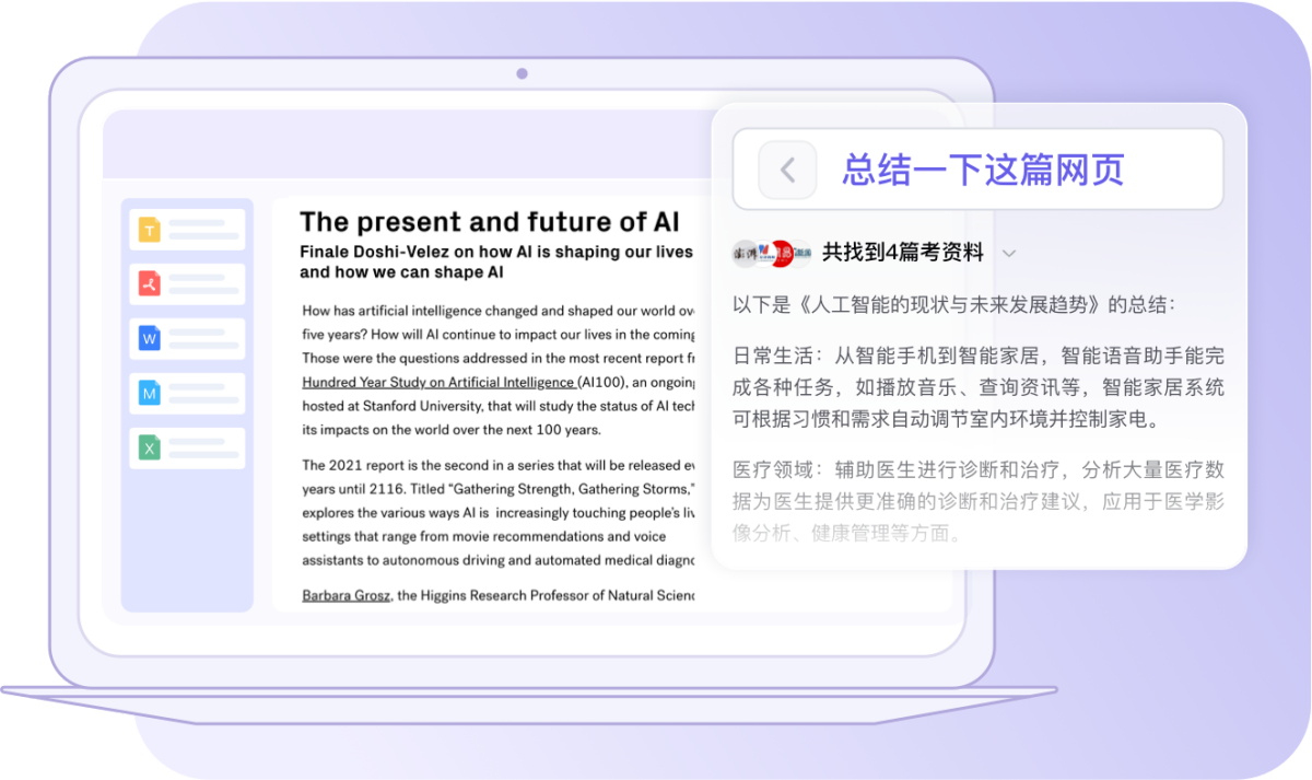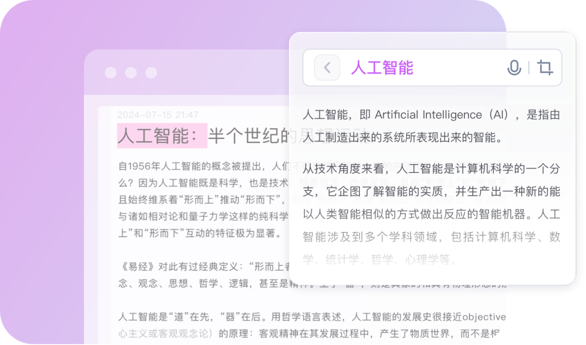 智能划词功能,可在任意界面选中文字进行实时翻译、信息提取或智能问答。