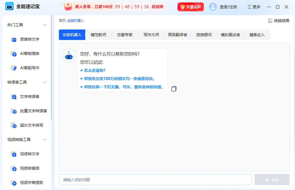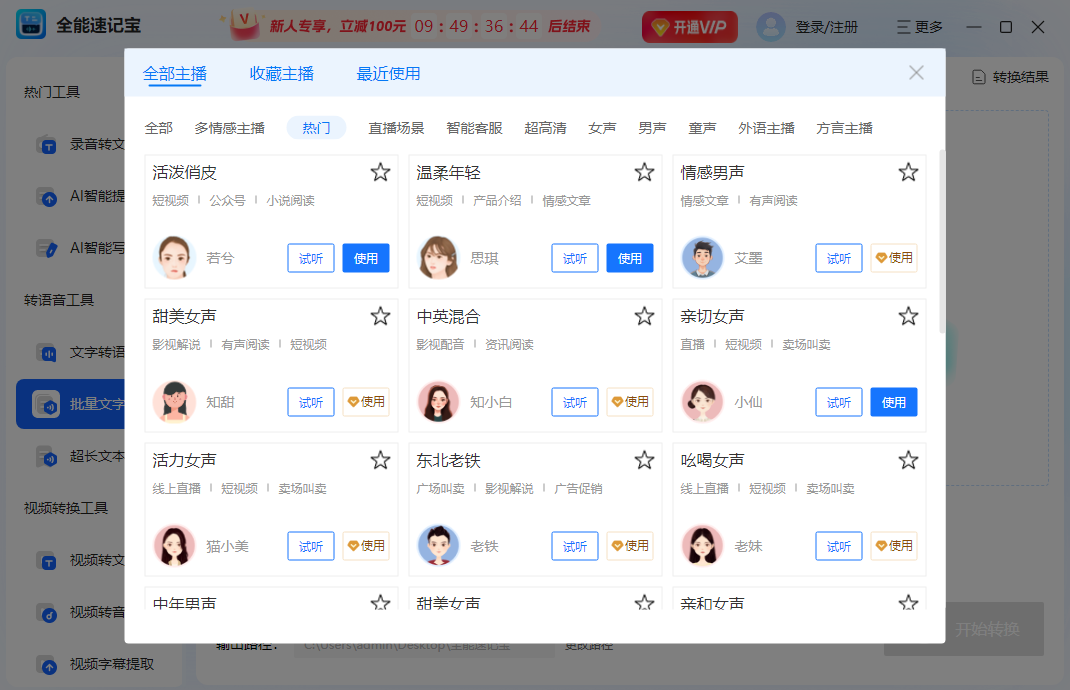全能速记宝除了主打录音转文字功能,还支持视频转文字,可一键提取视频中的语音内容;具备文字转语音功能,能模拟真人发声,内置百余种男女声;此外,还提供文本转写、多角色配音、视频转音频、视频提取字幕等工具。