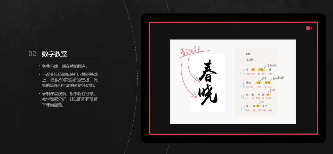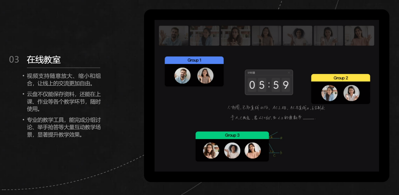 创新互动黑板功能,支持无级滚动书写、多人协同编辑,0.03~0.06 秒超低书写延时,板书体验媲美线下粉笔书写。