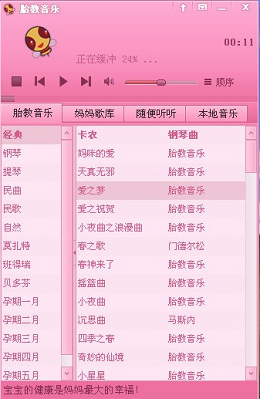 胎教音乐播放器是一款好用的胎教软件,胎教音乐播放器电脑版之中用户可以在软件之中播放各种音乐,幼儿在成长的时候听到音乐也会跟随动起来,舒缓的音乐可以让胎儿对外界声音更加敏感,发育也会更加完善。