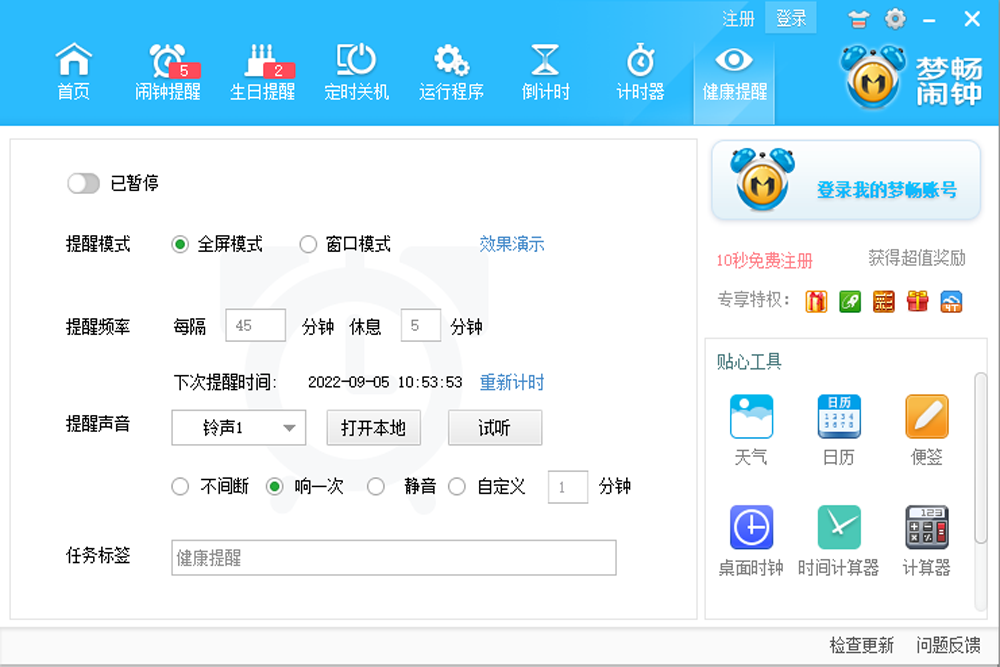 梦畅电脑闹钟是一款免费的定时软件,梦畅电脑闹钟2025最新版之中用户可以在软件之中设置各种时间,该软件在时间到了之后会立即提醒用户,方便用户想起需要做的事情,并且软件有着非常强大的任务定时要求,周期性时间提醒等等功能,帮助用户可以在忙碌之中也不会忘记事情。