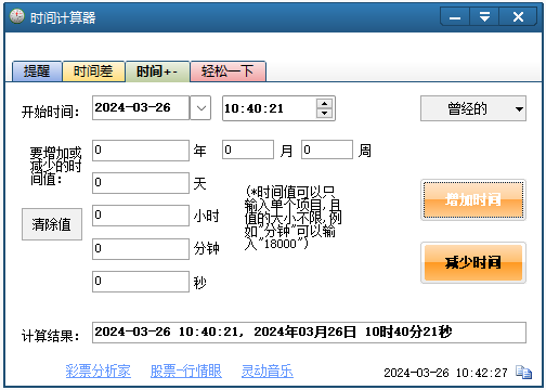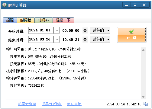 时间计算器是一款非常好用的时间工具,时间计算器电脑版之中用户可以在软件之中进行直接的时间计算,在软件之中用户可以直接计算特定时间减上目标时间,然后可以得出两者之间的年、日、时、分、秒等时间差距,可以让用户轻松做好时间分配。