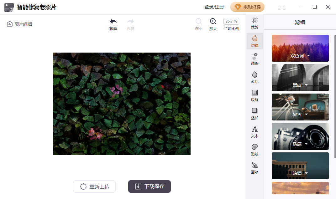 基于AI智能修复技术,可自动修复老照片裂痕、褪色等问题,实现4K高清还原,支持黑白照自动上色。