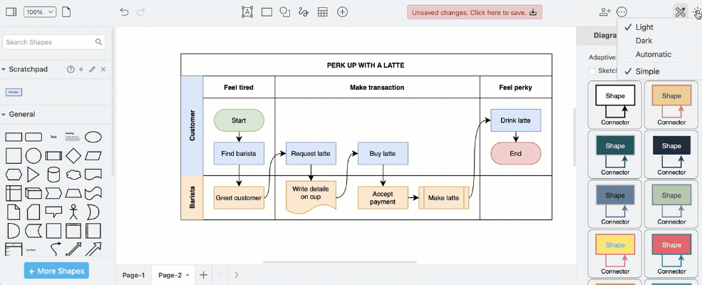 利用拖放界面和自动布局,用户可以轻松创建工作流程图。它帮助可视化任务顺序和决策步骤,适用于业务和开发流程,无需BPMN表示法的限制。