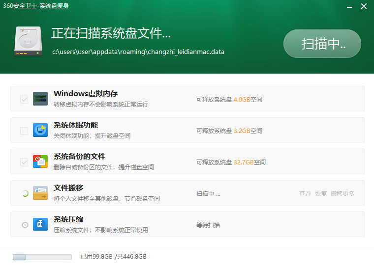 360系统盘瘦身是一款从360软件之中提取出来的专用于系统盘清理的工具,360系统盘瘦身电脑版之中用户可以利用工具进行系统大小的整体清理,并且帮助用户整理文件,删除备份的内容,让系统盘尽可能保留主要内容,也不会影响用户使用。
