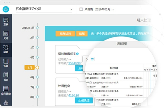 智能凭证生成,进销项发票自动生成凭证,内置成本 / 损益 / 税费结转模板,期末快速结账。