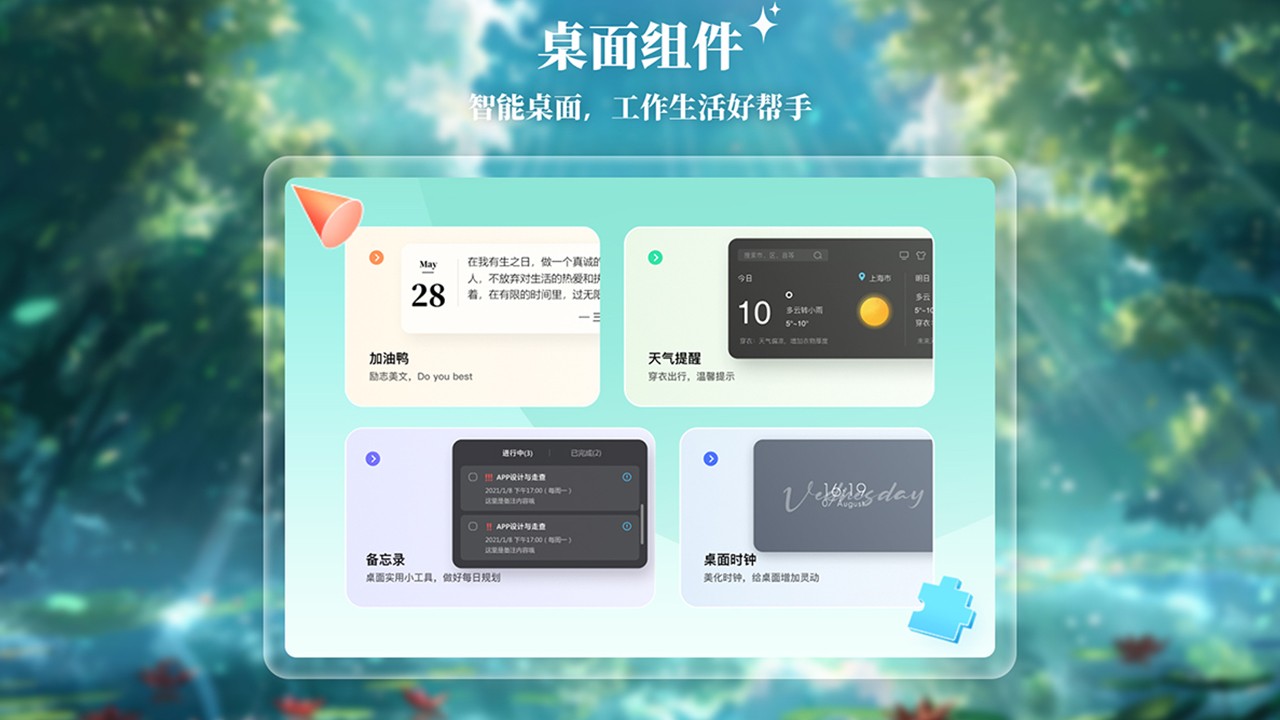 4、提供的智能桌面组件,如天气提醒、备忘录等,不仅美观实用,还能有效提升办公效率。用户无需打开其他应用程序,即可在桌面上快速查看天气信息、记录备忘事项,使工作和生活更加便捷高效。