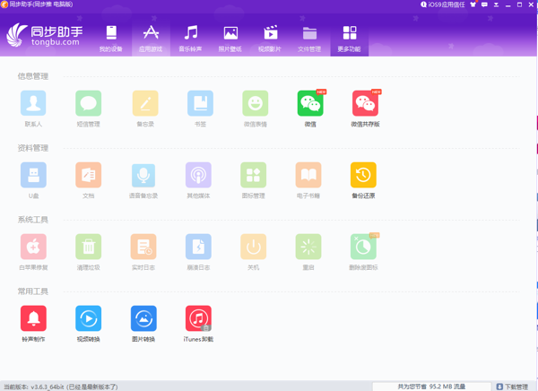 同步助手电脑版是一款功能全面的移动设备管理工具,同步助手2026最新版内置应用商店,可免费下载游戏和应用程序,专业垃圾清理模块,精准扫描并清理系统缓存、冗余文件、应用残留,释放设备存储空间,提升运行流畅度。