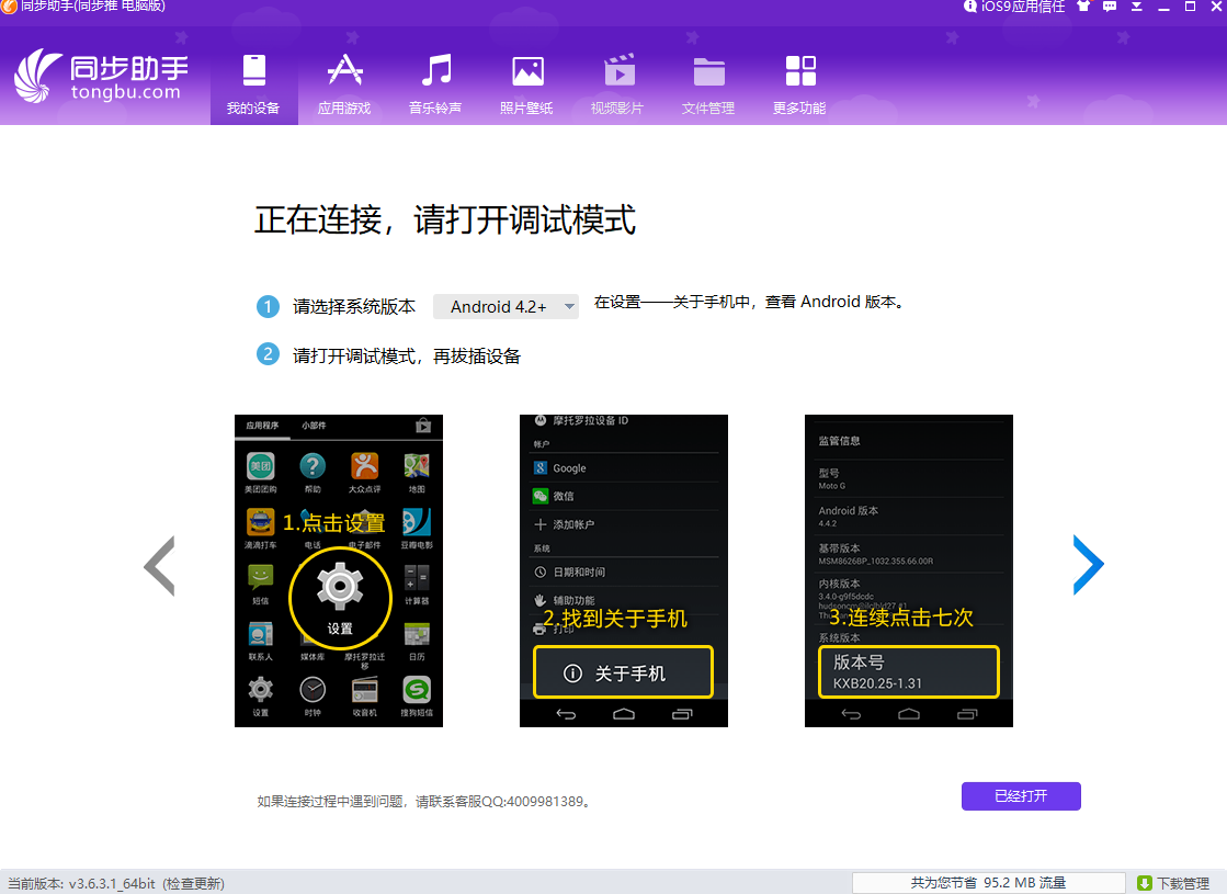 同步推界面设计简洁直观,用户无需过多的学习成本,便能快速上手,轻松完成设备管理,通过简单的一键操作,用户可以轻松实现数据传输、应用安装、系统修复等多项功能。