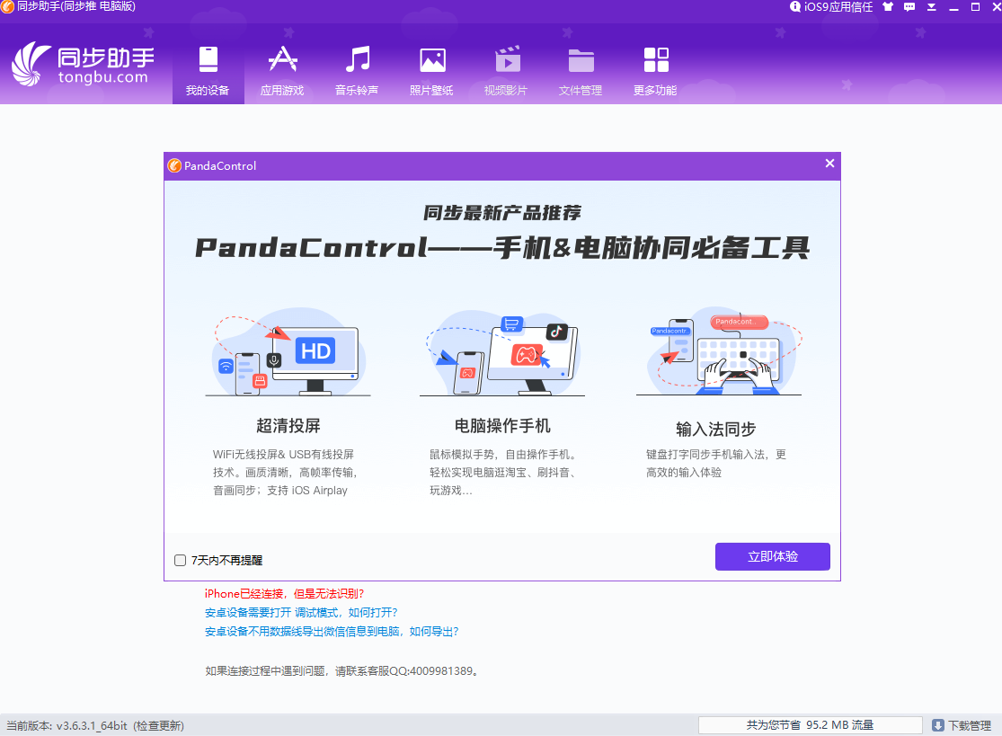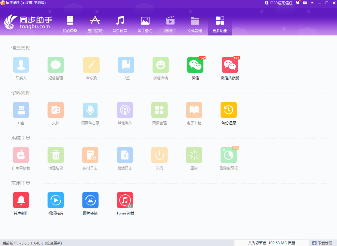 同步推是一款很实用的手机管理软件,同步推电脑版之中用户可以在手机连接之后对手机进行相关管理,软件可以帮助用户在iOS系统之中直接安装软件,无需通过应用商店允许就能运行,还可以直接清理垃圾,让手机更加流畅。