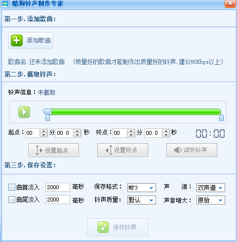 酷狗铃声制作专家是一款好用的铃声制作工具,酷狗铃声制作专家电脑版之中用户可以在软件添加需要制作铃声的歌曲,然后在软件之中直接制作铃声,就可以导出一个只有高潮好听部分的音频了,最后下载设置好即可。