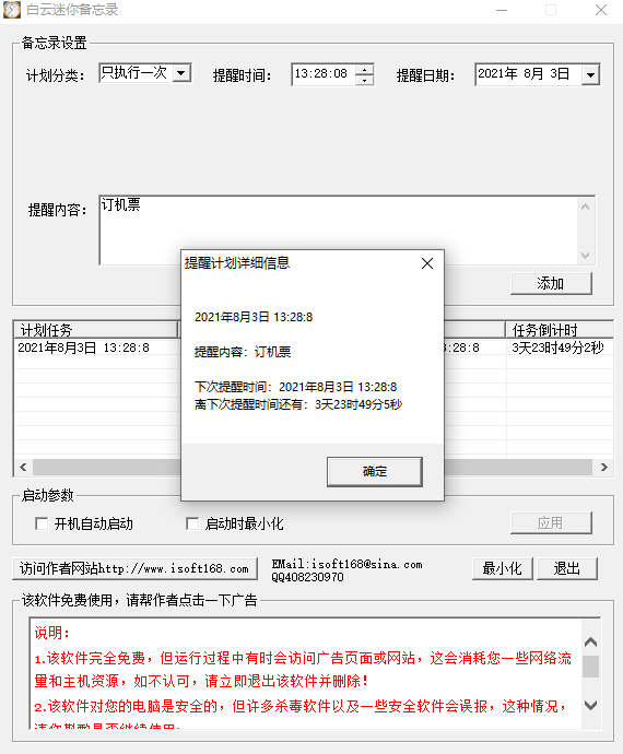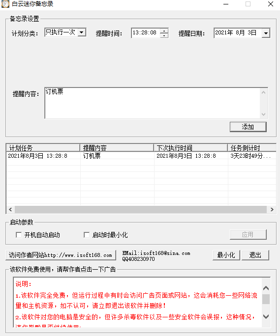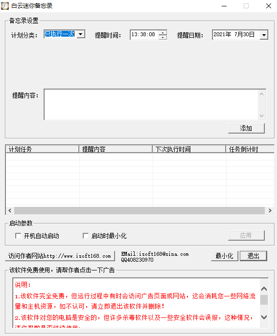 支持开机自启动功能,确保提醒服务持续运行;启动后可自动最小化至系统托盘,减少界面干扰。