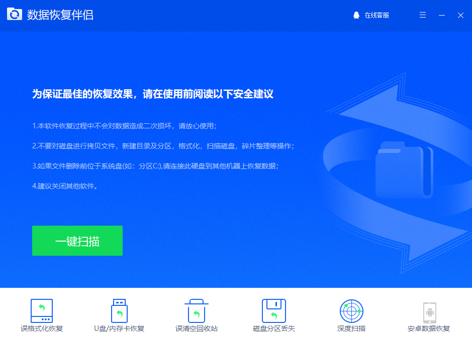 数据恢复伴侣是一款非常强大的数据恢复软件,数据恢复伴侣电脑版之中用户可以通过扫描功能,快速恢复各种文件以及丢失的数据,软件不仅仅可以恢复设备之中的丢失的数据,还可以恢复硬盘、u盘、内存卡等等外置设备的数据内容。