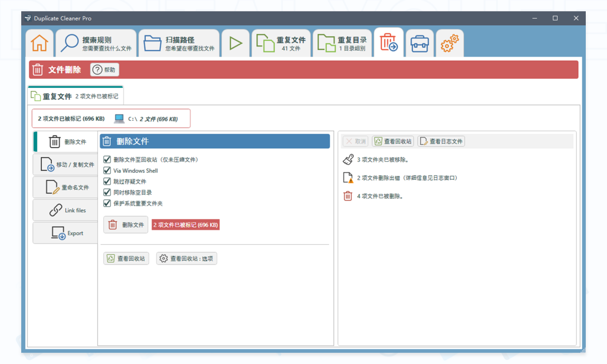Duplicate Cleaner Pro面向高级用户的专业功能。软件能够识别并处理硬链接,在清理重复文件时,可以选择用硬链接替换副本,从而在不占用额外磁盘空间的前提下,保持所有文件路径的有效性。这对于管理虚拟机文件、大型项目文件等场景非常有用。
