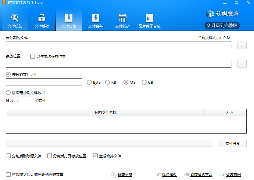 支持大文件按指定大小分割,合并时通过校验码确保无损重组。