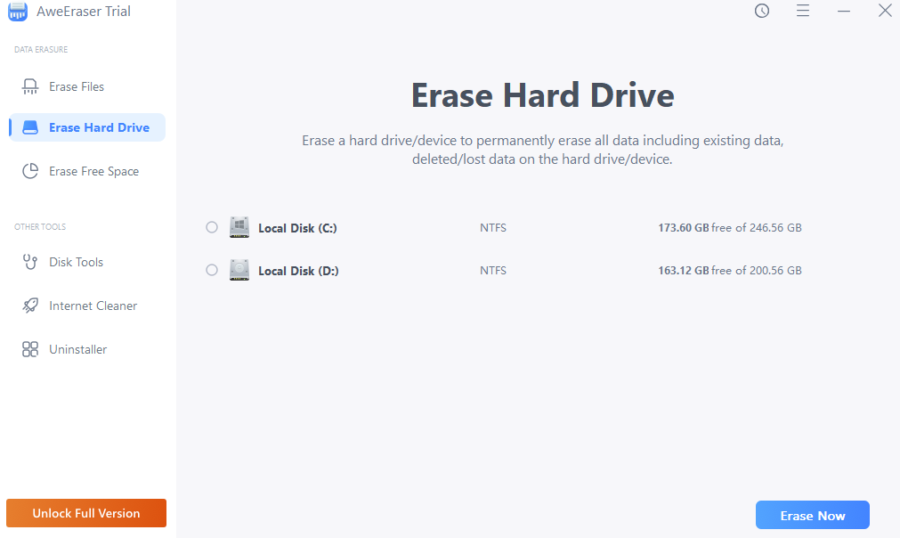 AweEraser是一款非常专业的数据擦除工具,AweEraser电脑版有着非常强大的数据清除功能,可以直接清除硬盘之中的数据内容,清除之后的数据将会直接消失,不会在硬盘之中留下痕迹,让硬盘可以一直保持高速运行的状态。