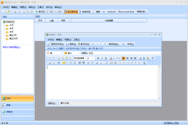 效能日记本是一块很好用的记事本工具,效能日记本电脑版之中用户可以快速进行内容写作,软件支持各种语言,支持每日内容查询以及记录好内容花费,可以帮助用户做好支出和收录准备,帮助用户更好的记录好生活的点点滴滴。
