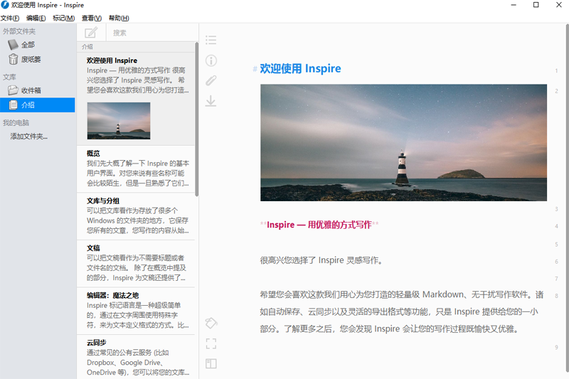 Inspire是一款很好用的文本编辑工具,Inspire电脑版之中用户可以自由的选择写作的模式,可以沉浸式进行全屏写作,也可以分心一边进行阅读一边进行写作,软件具备很强的保存功能,在固定时间后会自动进行保存,并且软件还会自动进行备份,防止作品消失。