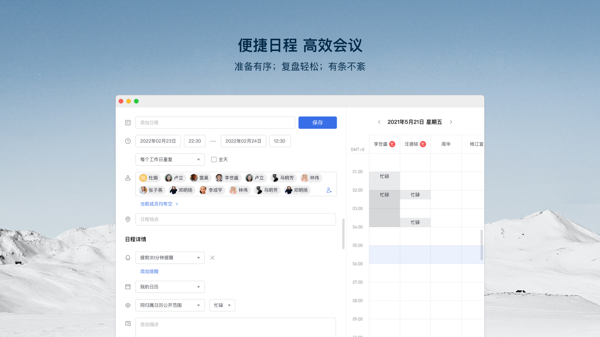 高效日程会议管理,智能日历支持忙闲订阅、一键预定会议,会后 AI 自动生成思维导图式复盘报告,任务分配跟进更便捷。