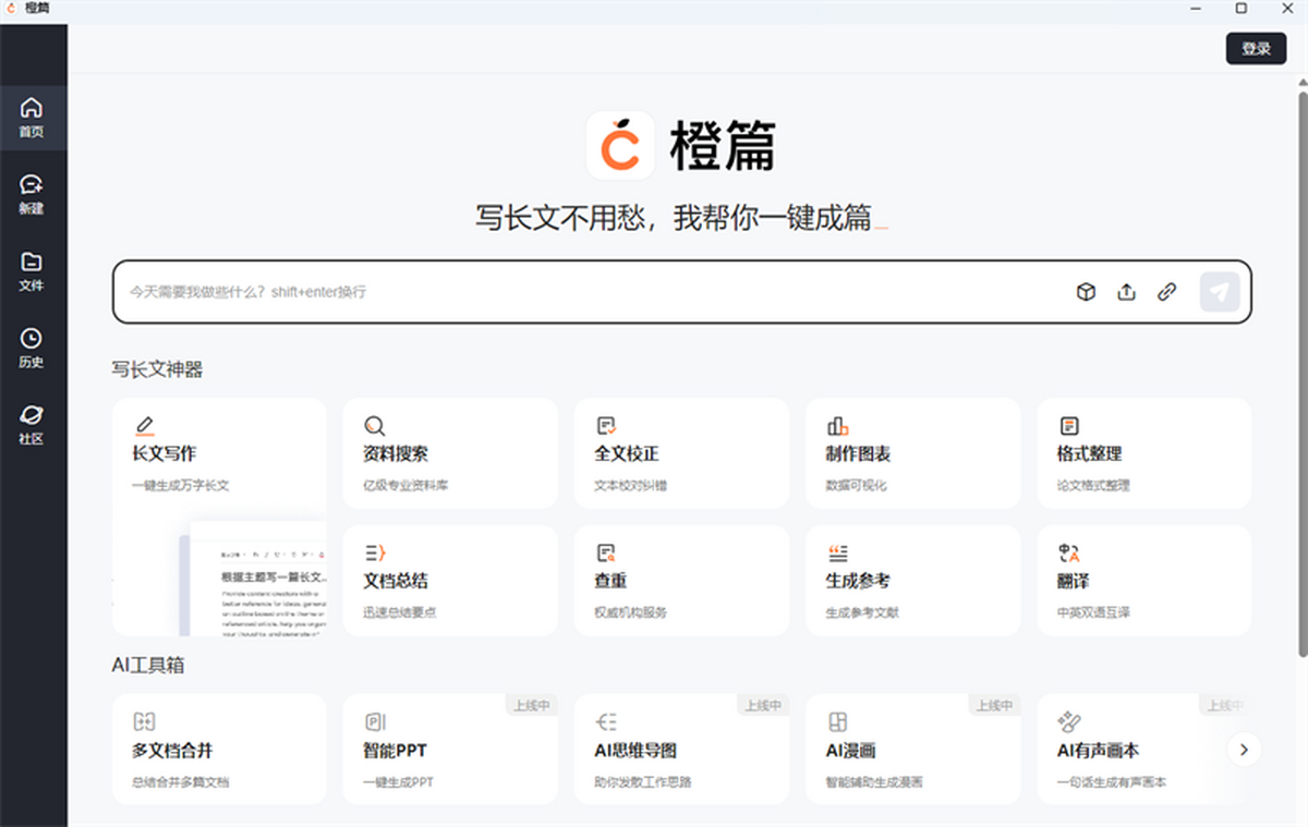 橙篇之中有着润色、扩写、续写等等强大的功能,可以帮助用户完成校正文本、制作图表、整理格式、论文查重、多语言翻译等多种办公需求,可以帮助用户快速完成工作任务。