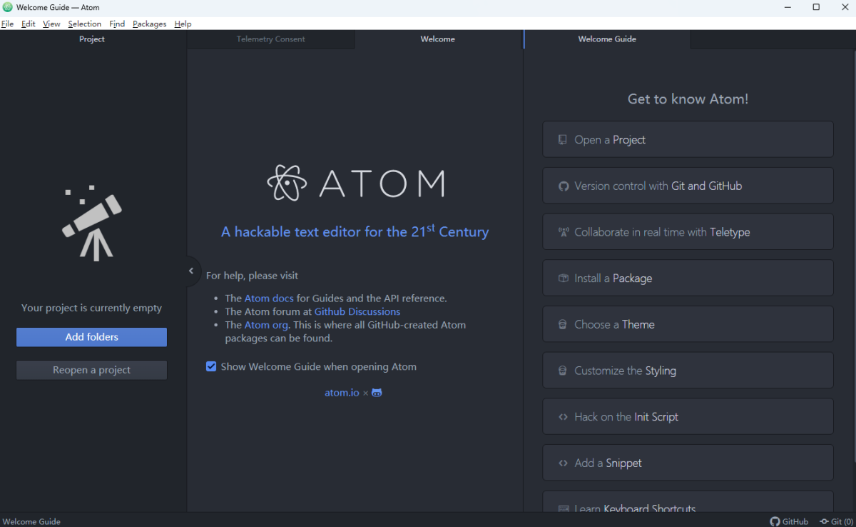 ATOM是一款很好用的代码编辑工具,ATOM电脑版之中软件支持多种编程语言进行工作,软件界面简洁好用,并且支持多种工具以及辅助宏内容,尽可能减少工作量,让用户可以快速完成工作。
