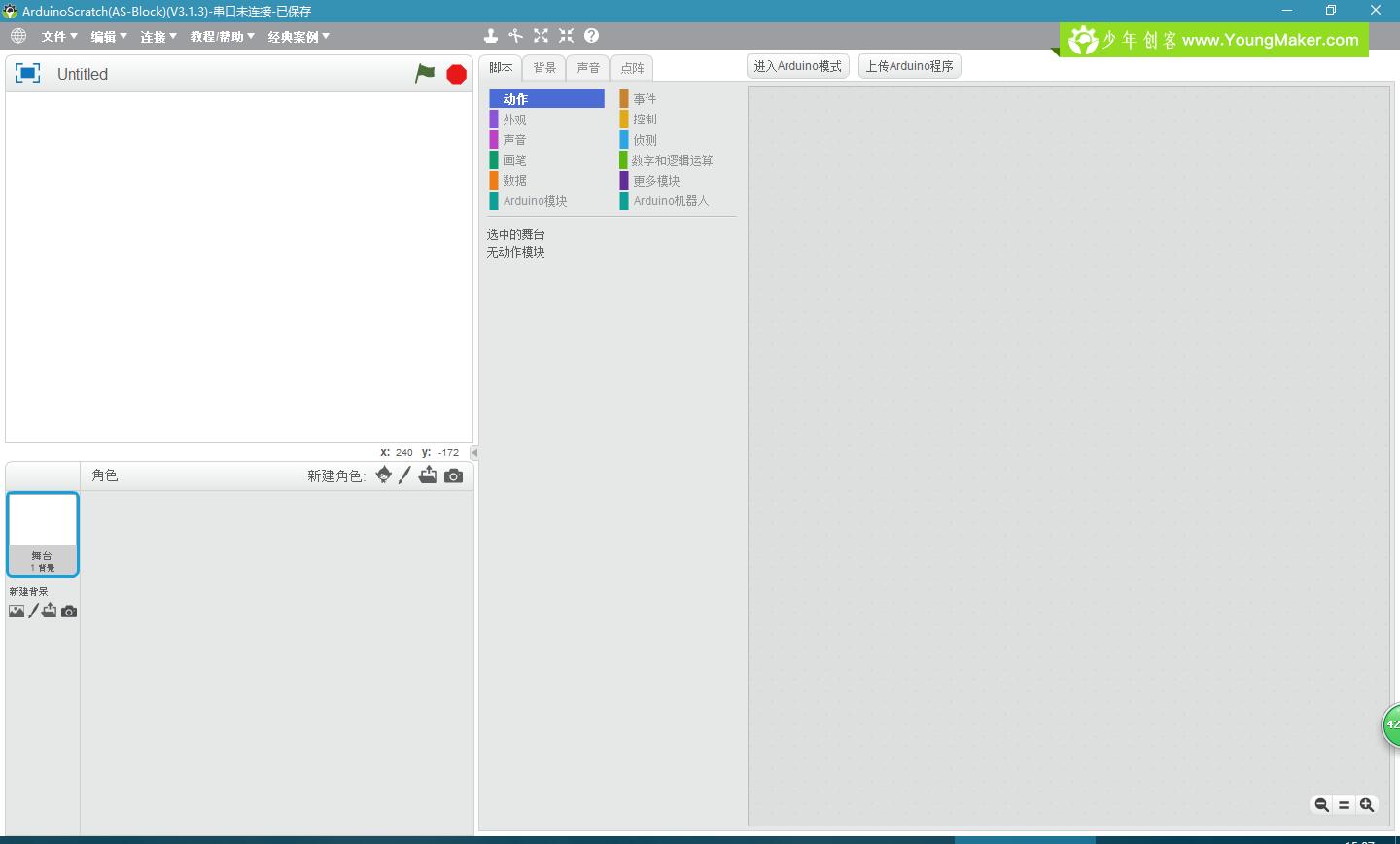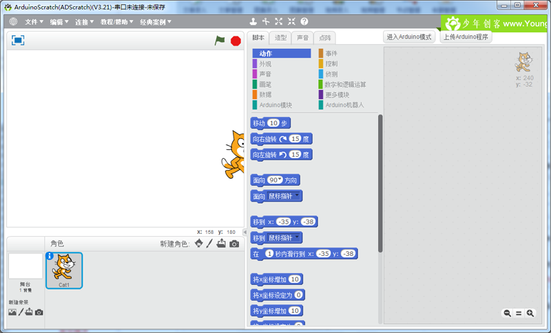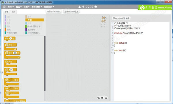 ArduinoScratch可以通过拖拽积木式的简单编程,来控制真实的物理世界,软件极大地降低了硬件编程的门槛,是STEAM教育中“软硬件结合”的典范,采用Scratch的图形化积木编程界面,用户无需学习复杂的C/C++语法,只需像搭积木一样拖拽、组合指令块,即可编写程序逻辑。这让孩子和编程初学者也能轻松上手。