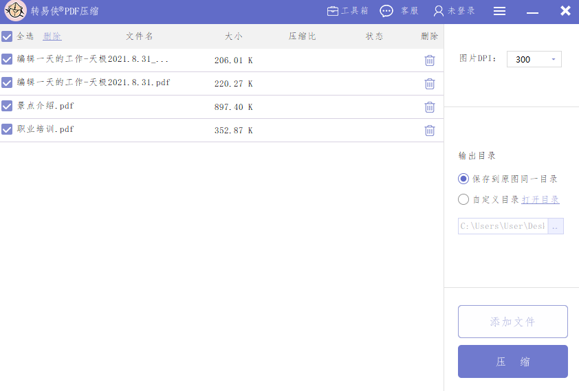 转易侠PDF压缩是一款好用的PDF压缩工具,转易侠PDF压缩电脑版之中用户可以在软件中进行PDF文件压缩,软件支持压缩文件的像素以及大小,让文件压缩方式可以根据用户的需求来改变,并且软件有着很强大的批量压缩功能,一键帮助用户完成工作。