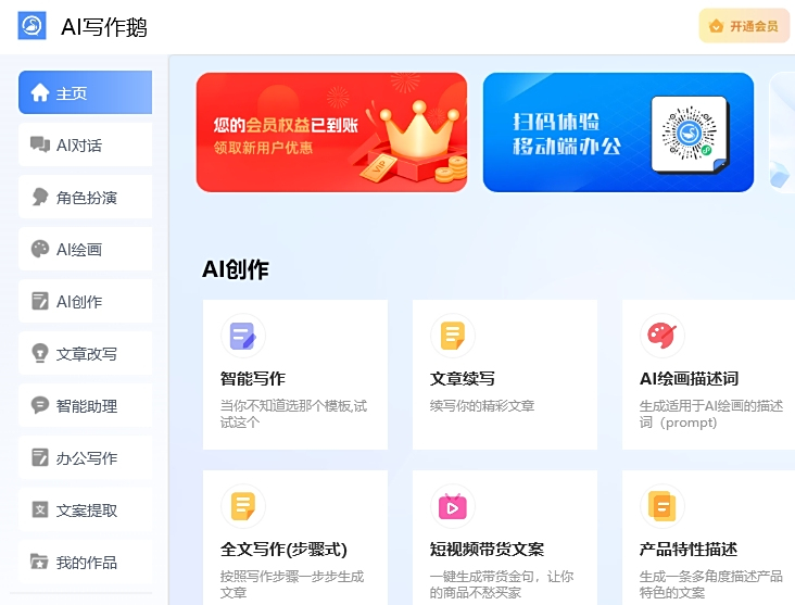 AI写作鹅利用人工智能技术辅助用户进行中文内容创作,软件通过提供丰富的写作模板、智能的文本生成与优化功能,帮助用户快速高效地生成各类文案和文稿,大幅降低写作门槛和耗时。